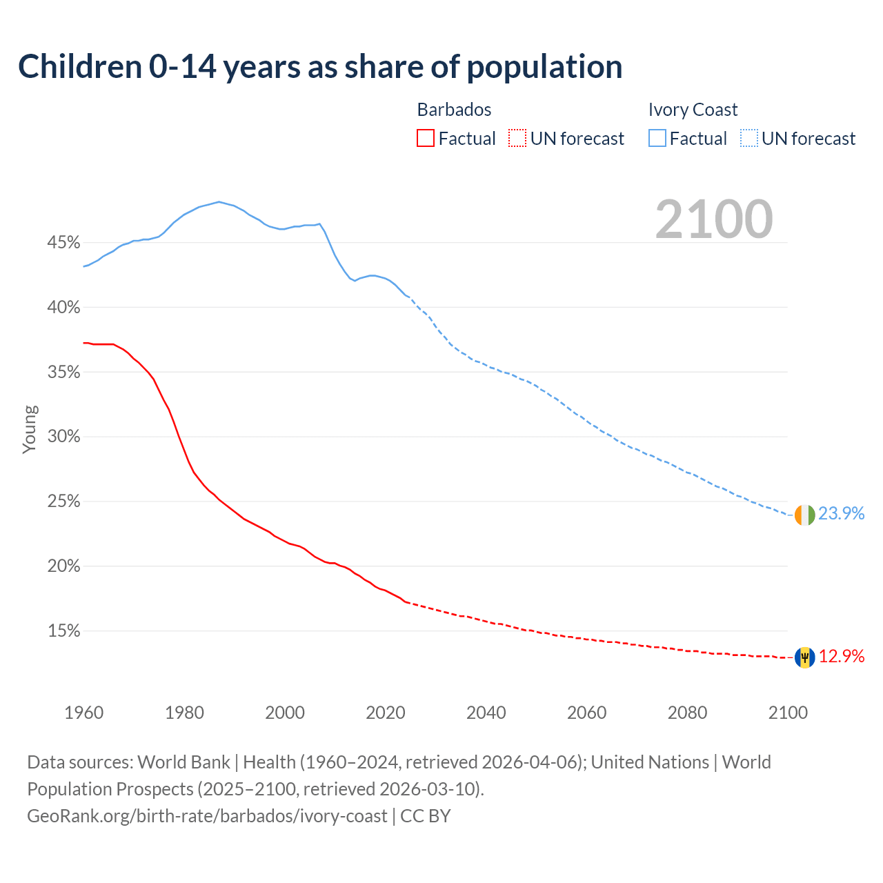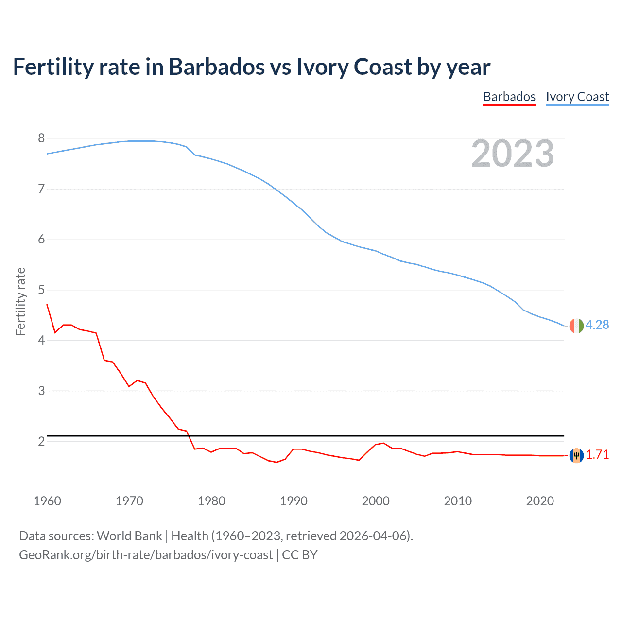 According to the latest available data on birth rates, the fertility rate in Barbados was 1.71 children per woman in 2023, compared to 4.28 in Ivory Coast in 2023. The replacement level is considered to be 2.1 children per woman.