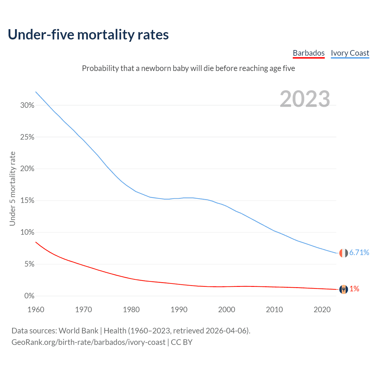 The chance that a newborn baby will die before reaching age five is 1% in Barbados and 6.71% in Ivory Coast. Above is a chart with historical data on under-five mortality rates.
