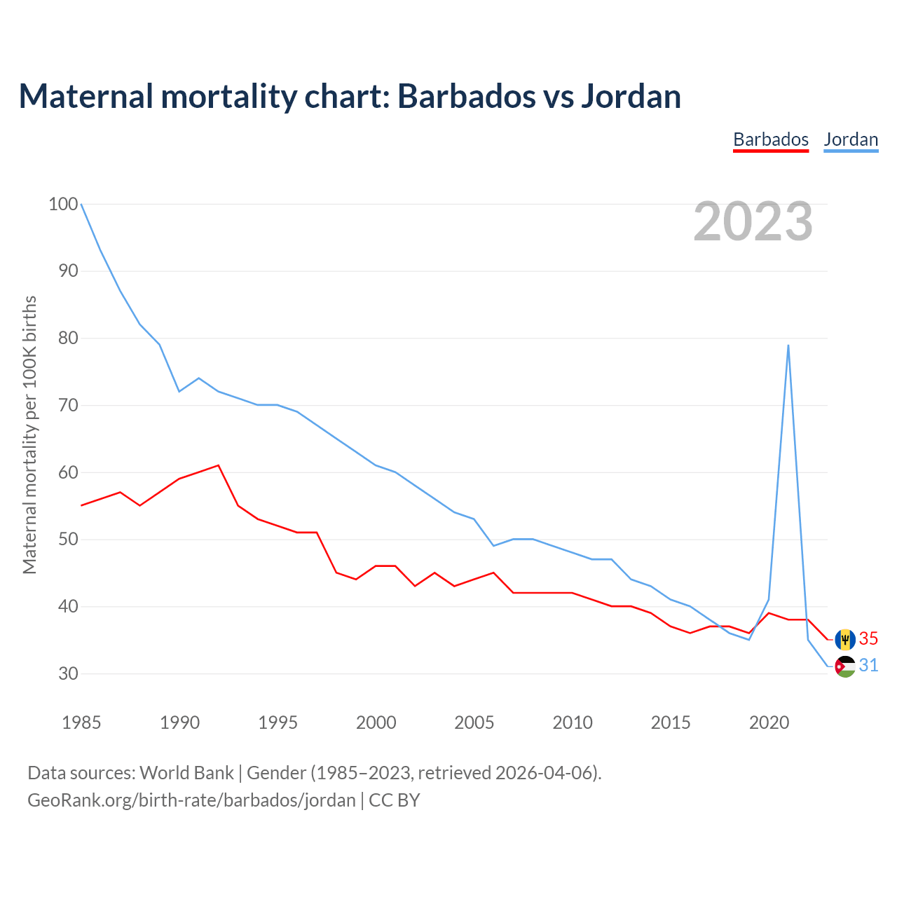 The maternal mortality rate, which is the probability of dying during childbirth or within 42 days of pregnancy termination, is 35 deaths per 100,000 live births in Barbados, compared to 31 deaths in Jordan.