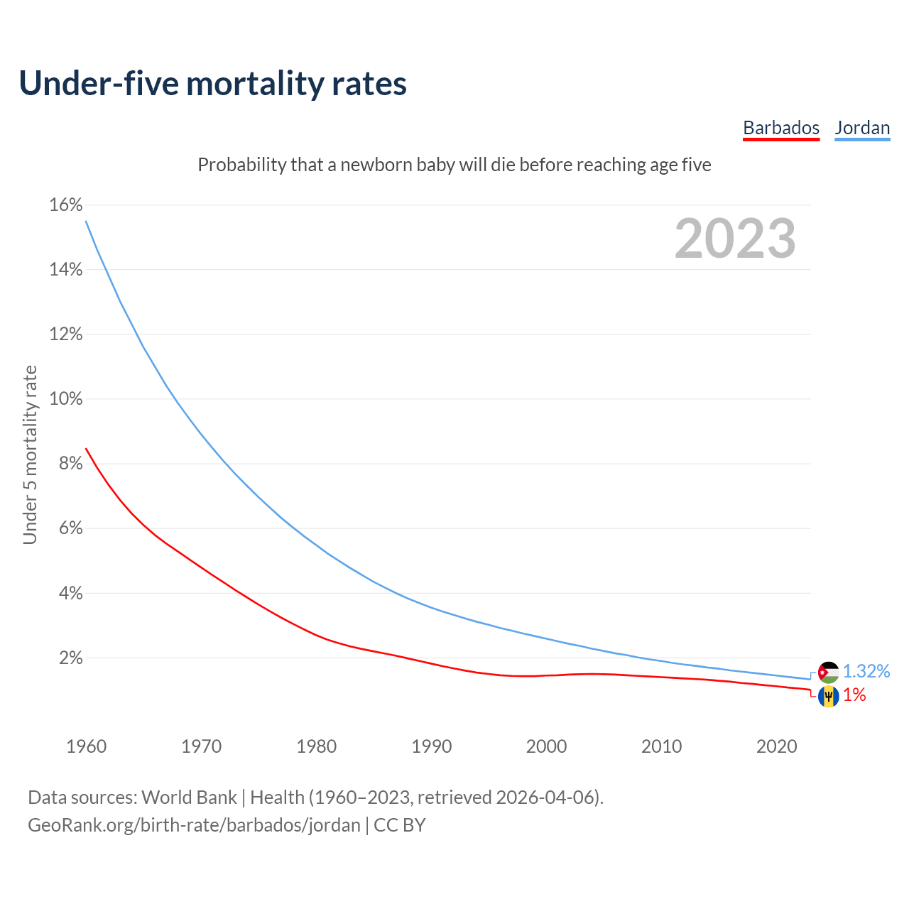 The chance that a newborn baby will die before reaching age five is 1% in Barbados and 1.32% in Jordan. Above is a chart with historical data on under-five mortality rates.