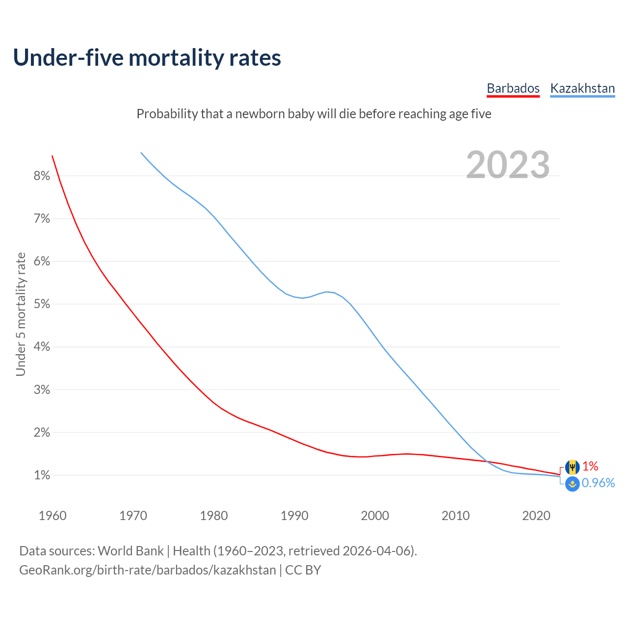 The chance that a newborn baby will die before reaching age five is 1% in Barbados and 0.96% in Kazakhstan. Above is a chart with historical data on under-five mortality rates.