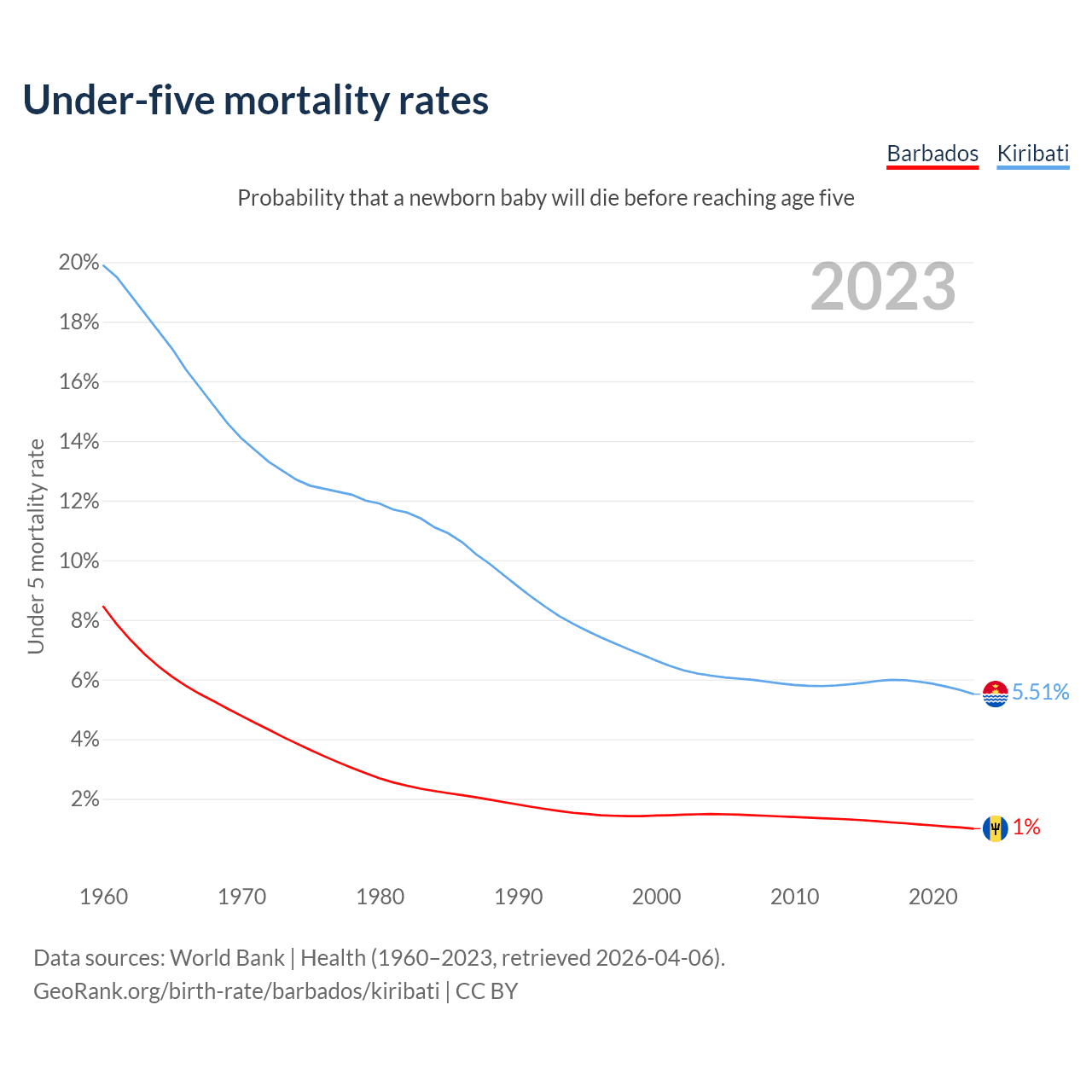 The chance that a newborn baby will die before reaching age five is 1% in Barbados and 5.51% in Kiribati. Above is a chart with historical data on under-five mortality rates.