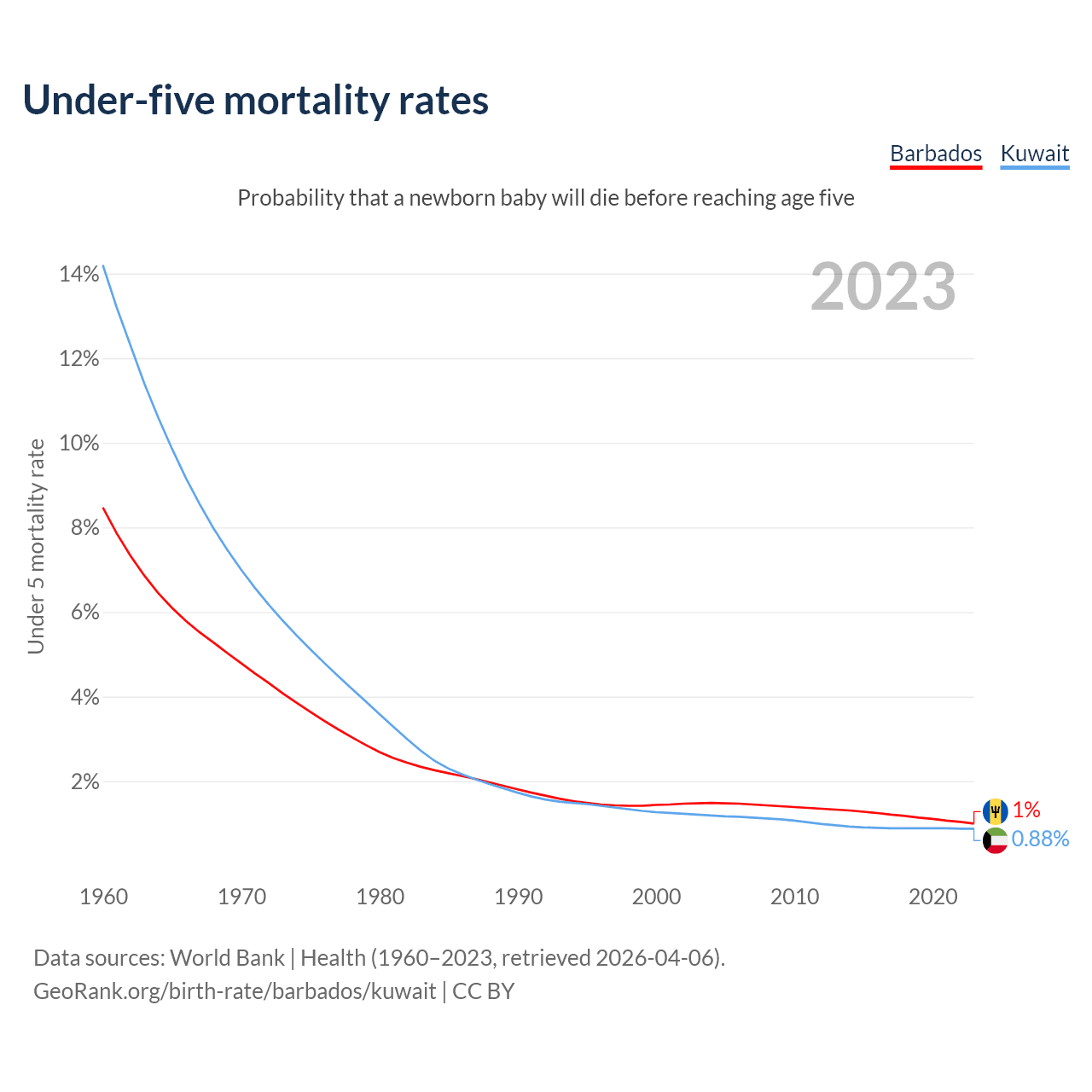 The chance that a newborn baby will die before reaching age five is 1% in Barbados and 0.88% in Kuwait. Above is a chart with historical data on under-five mortality rates.