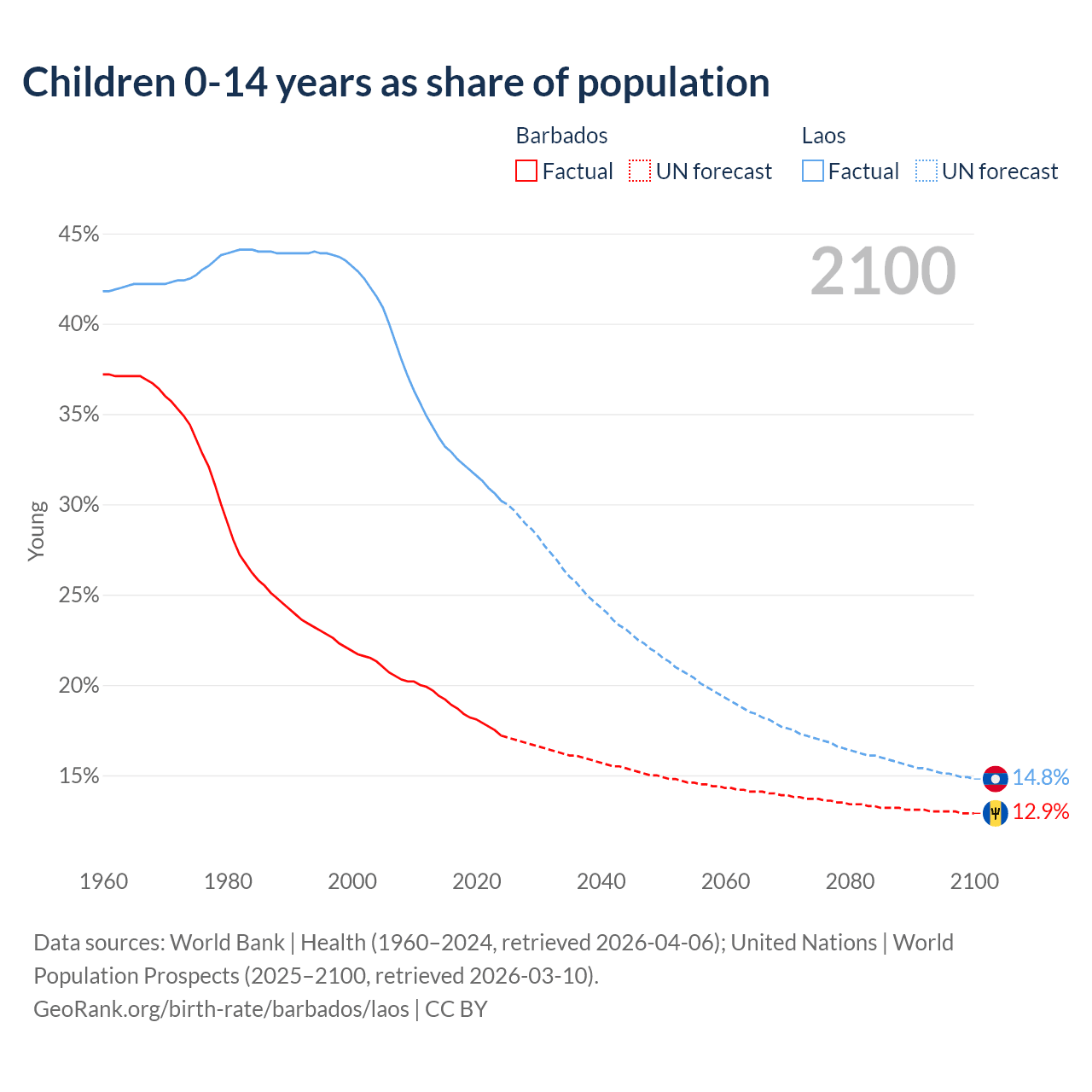 According to the latest available data on birth rates, the fertility rate in Barbados was 1.71 children per woman in 2023, compared to 2.42 in Laos in 2023. The replacement level is considered to be 2.1 children per woman.