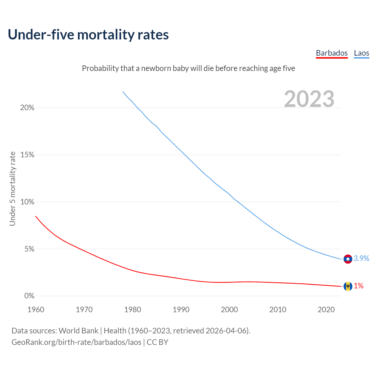 The chance that a newborn baby will die before reaching age five is 1% in Barbados and 3.9% in Laos. Above is a chart with historical data on under-five mortality rates.