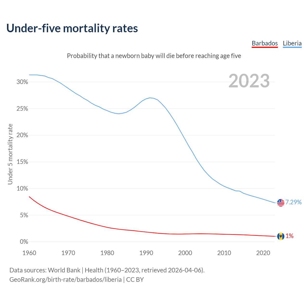 The chance that a newborn baby will die before reaching age five is 1% in Barbados and 7.29% in Liberia. Above is a chart with historical data on under-five mortality rates.