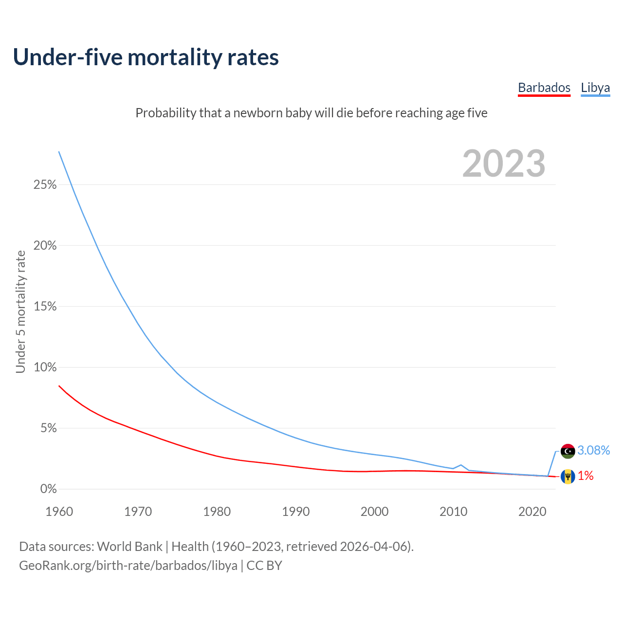 The chance that a newborn baby will die before reaching age five is 1% in Barbados and 3.08% in Libya. Above is a chart with historical data on under-five mortality rates.