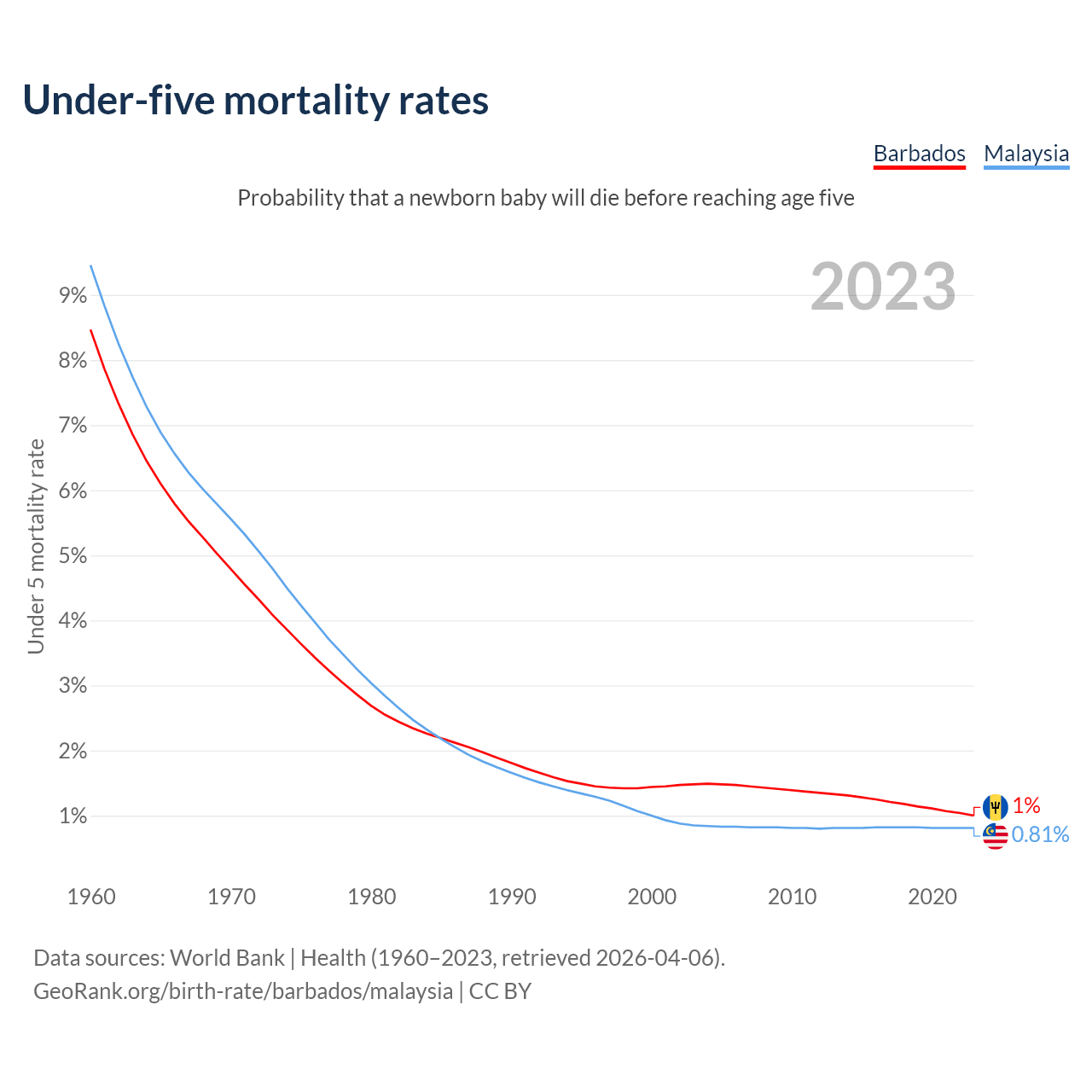 The chance that a newborn baby will die before reaching age five is 1% in Barbados and 0.81% in Malaysia. Above is a chart with historical data on under-five mortality rates.