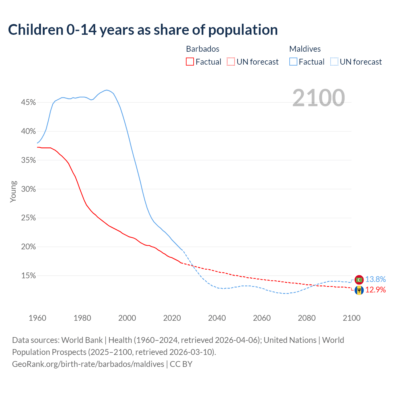 According to the latest available data on birth rates, the fertility rate in Barbados was 1.71 children per woman in 2023, compared to 1.58 in Maldives in 2023. The replacement level is considered to be 2.1 children per woman.
