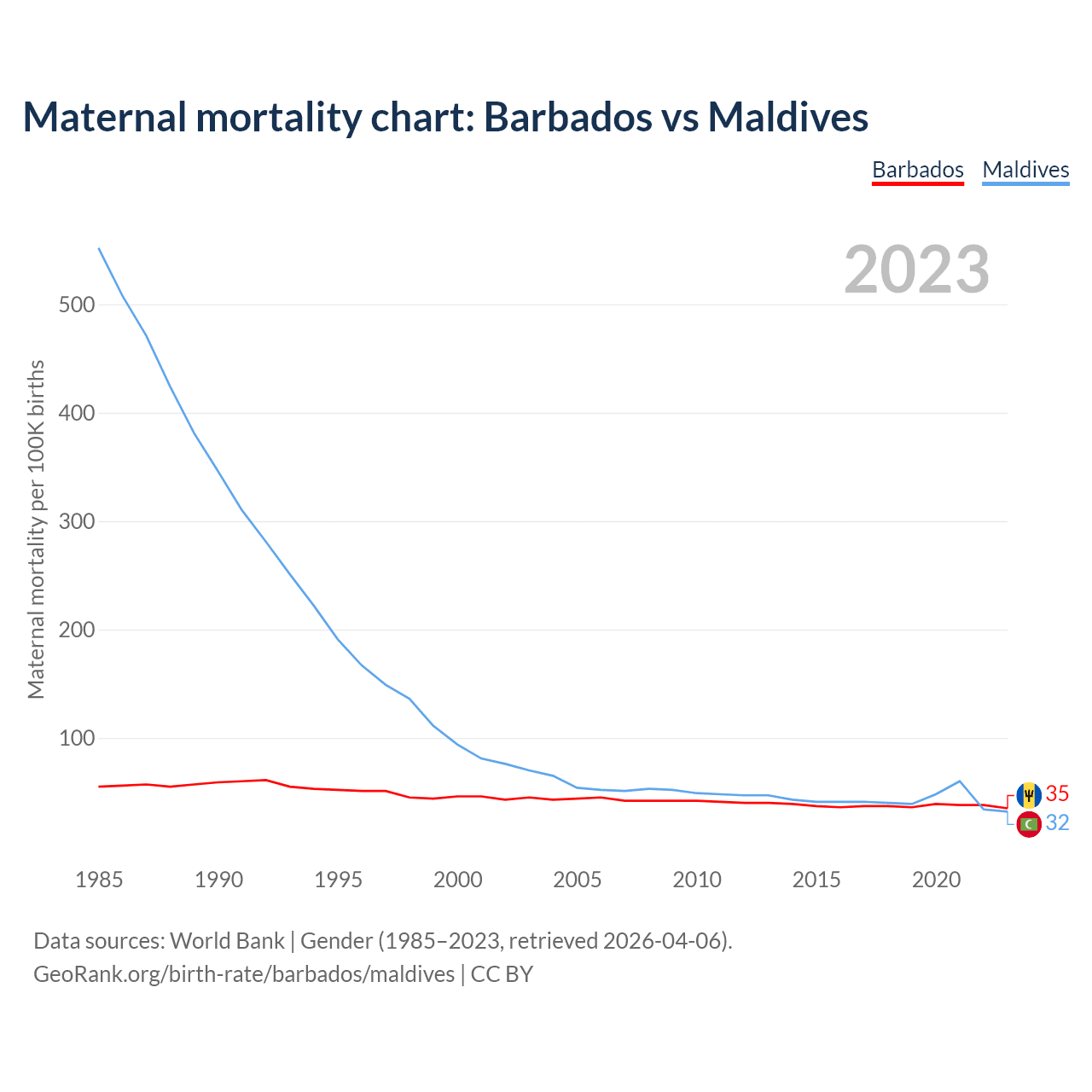The maternal mortality rate, which is the probability of dying during childbirth or within 42 days of pregnancy termination, is 35 deaths per 100,000 live births in Barbados, compared to 32 deaths in Maldives.