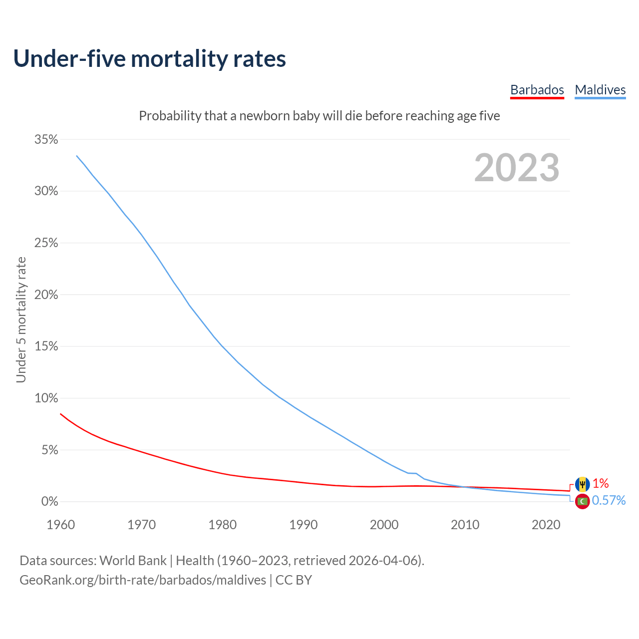 The chance that a newborn baby will die before reaching age five is 1% in Barbados and 0.57% in Maldives. Above is a chart with historical data on under-five mortality rates.