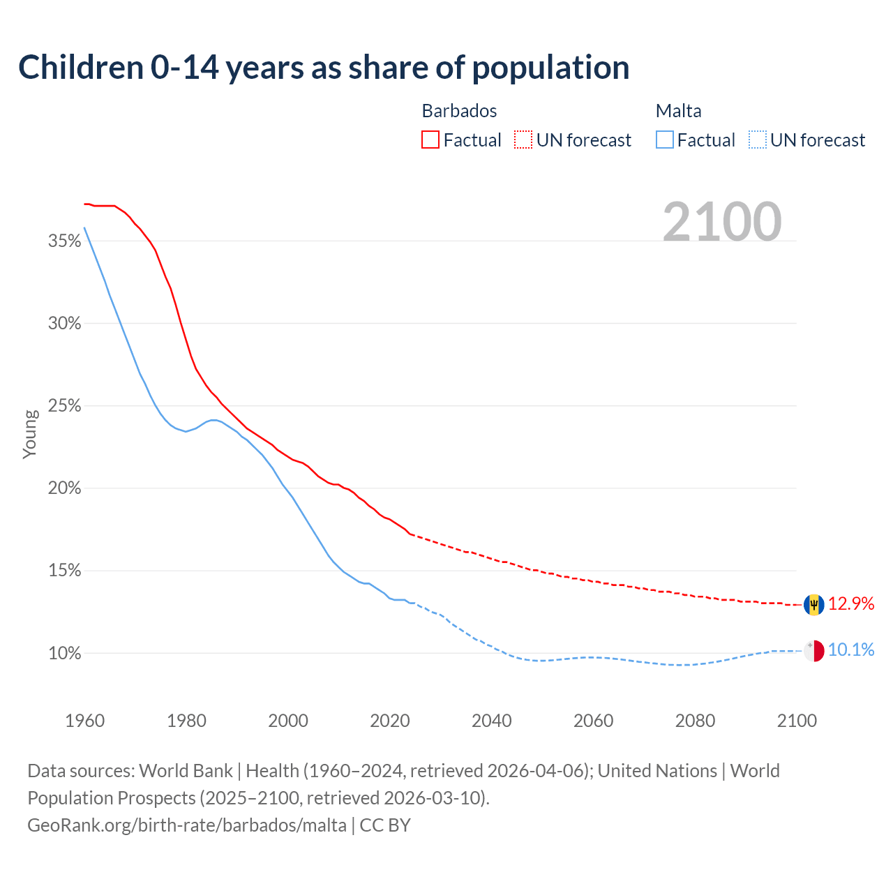 According to the latest available data on birth rates, the fertility rate in Barbados was 1.71 children per woman in 2023, compared to 1.06 in Malta in 2023. The replacement level is considered to be 2.1 children per woman.