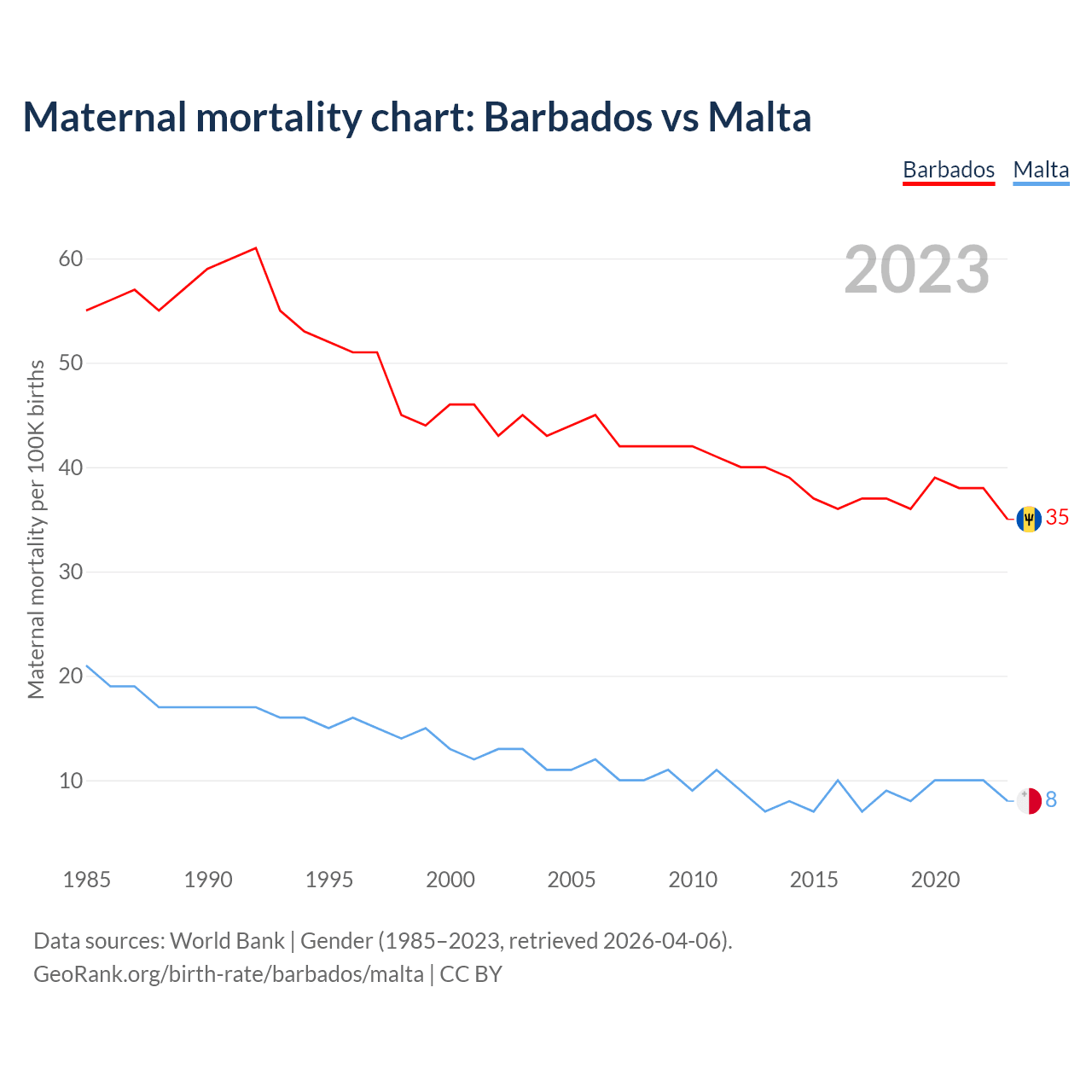 The maternal mortality rate, which is the probability of dying during childbirth or within 42 days of pregnancy termination, is 35 deaths per 100,000 live births in Barbados, compared to 8 deaths in Malta.