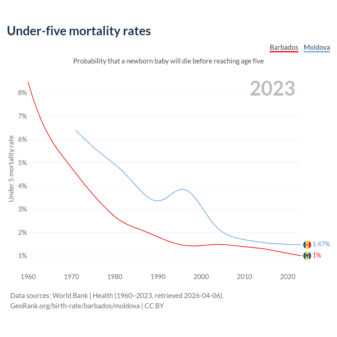 The chance that a newborn baby will die before reaching age five is 1% in Barbados and 1.47% in Moldova. Above is a chart with historical data on under-five mortality rates.