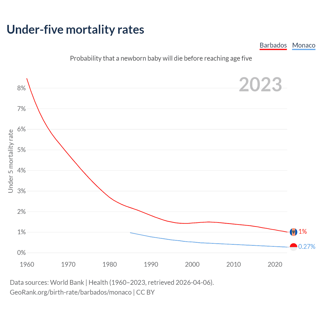 The chance that a newborn baby will die before reaching age five is 1% in Barbados and 0.27% in Monaco. Above is a chart with historical data on under-five mortality rates.