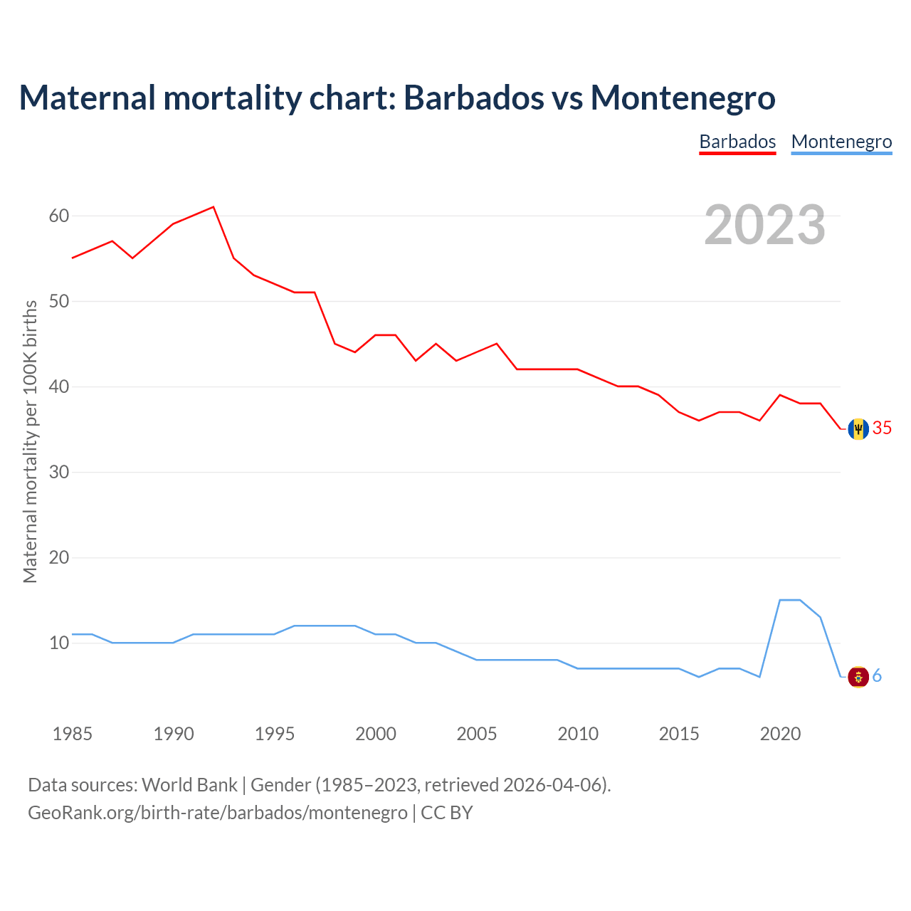 The maternal mortality rate, which is the probability of dying during childbirth or within 42 days of pregnancy termination, is 35 deaths per 100,000 live births in Barbados, compared to 6 deaths in Montenegro.