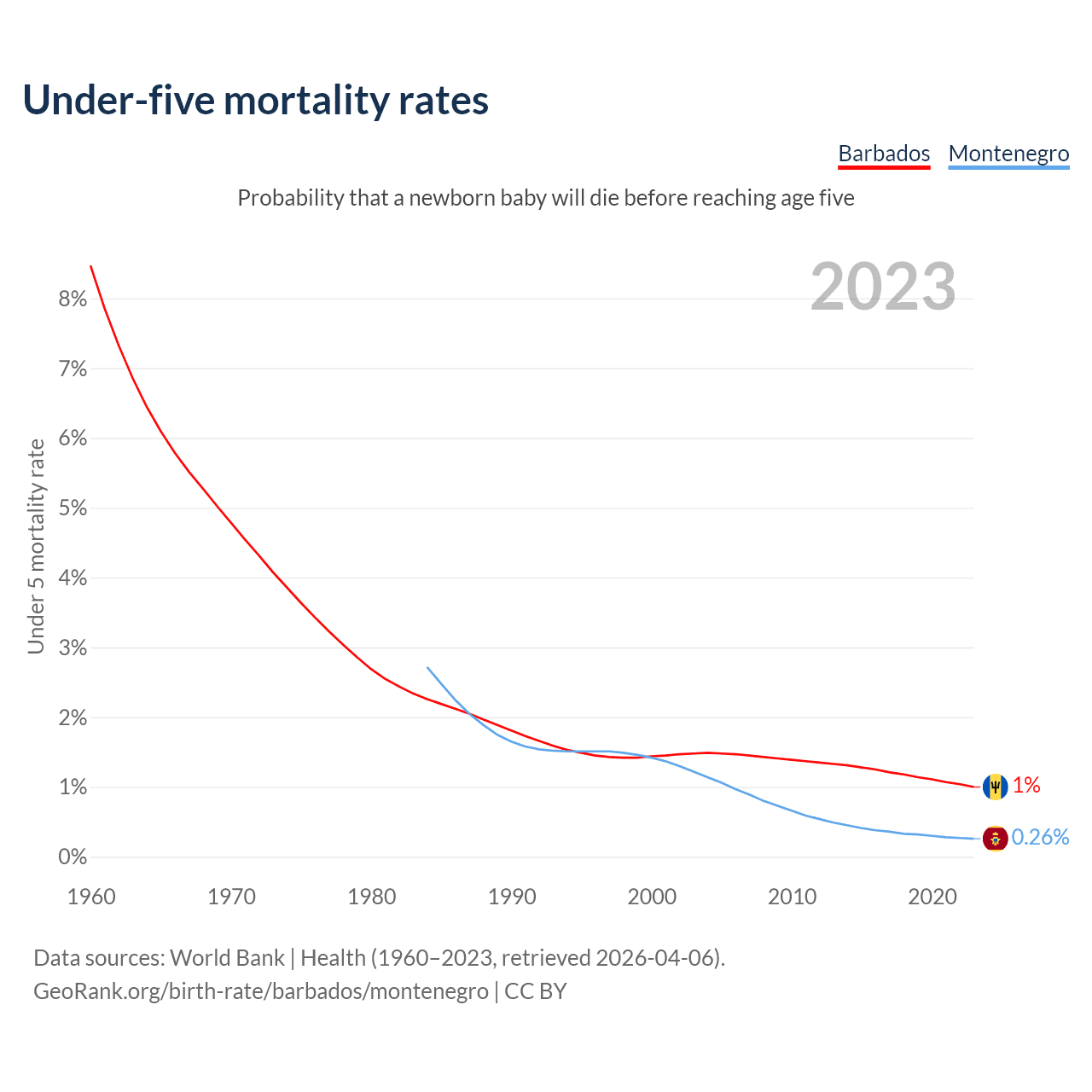 The chance that a newborn baby will die before reaching age five is 1% in Barbados and 0.26% in Montenegro. Above is a chart with historical data on under-five mortality rates.