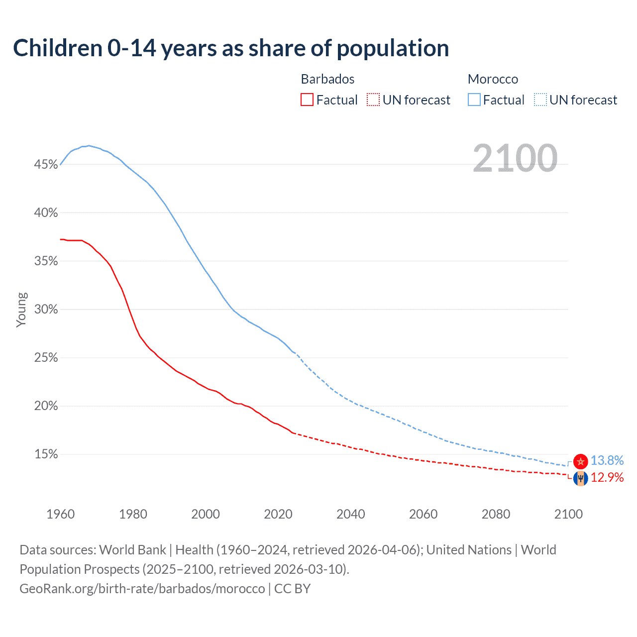 According to the latest available data on birth rates, the fertility rate in Barbados was 1.71 children per woman in 2023, compared to 2.23 in Morocco in 2023. The replacement level is considered to be 2.1 children per woman.