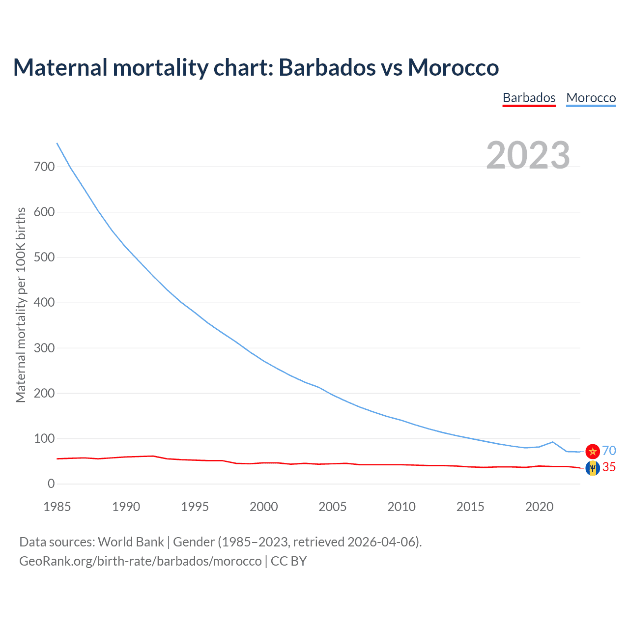 The maternal mortality rate, which is the probability of dying during childbirth or within 42 days of pregnancy termination, is 35 deaths per 100,000 live births in Barbados, compared to 70 deaths in Morocco.
