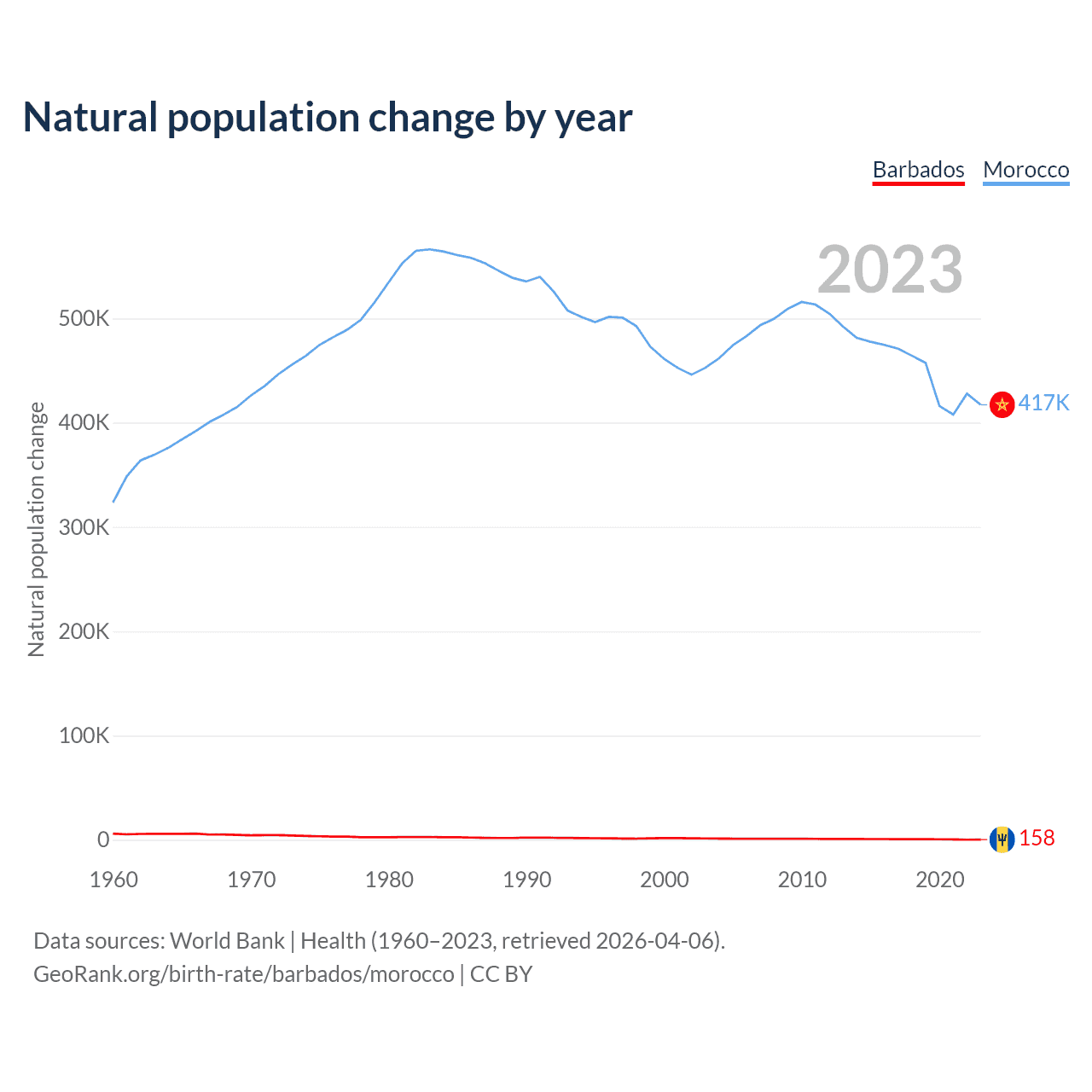 Barbados has an annual birth rate of 11.2 births per 1,000 people, compared to 16.7 for Morocco. The average number of children a woman is expected to have during her lifetime — the fertility rate, is 1.71 in Barbados and 2.23 in Morocco — 30.6% difference.