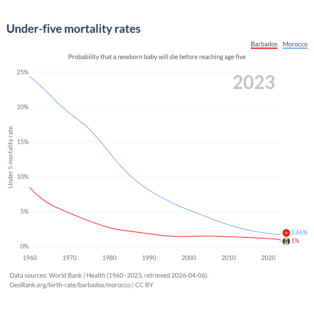 The chance that a newborn baby will die before reaching age five is 1% in Barbados and 1.66% in Morocco. Above is a chart with historical data on under-five mortality rates.