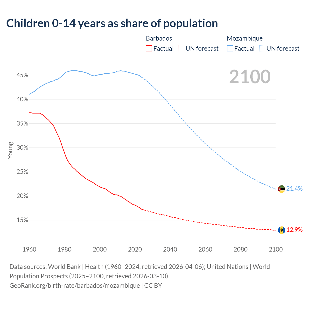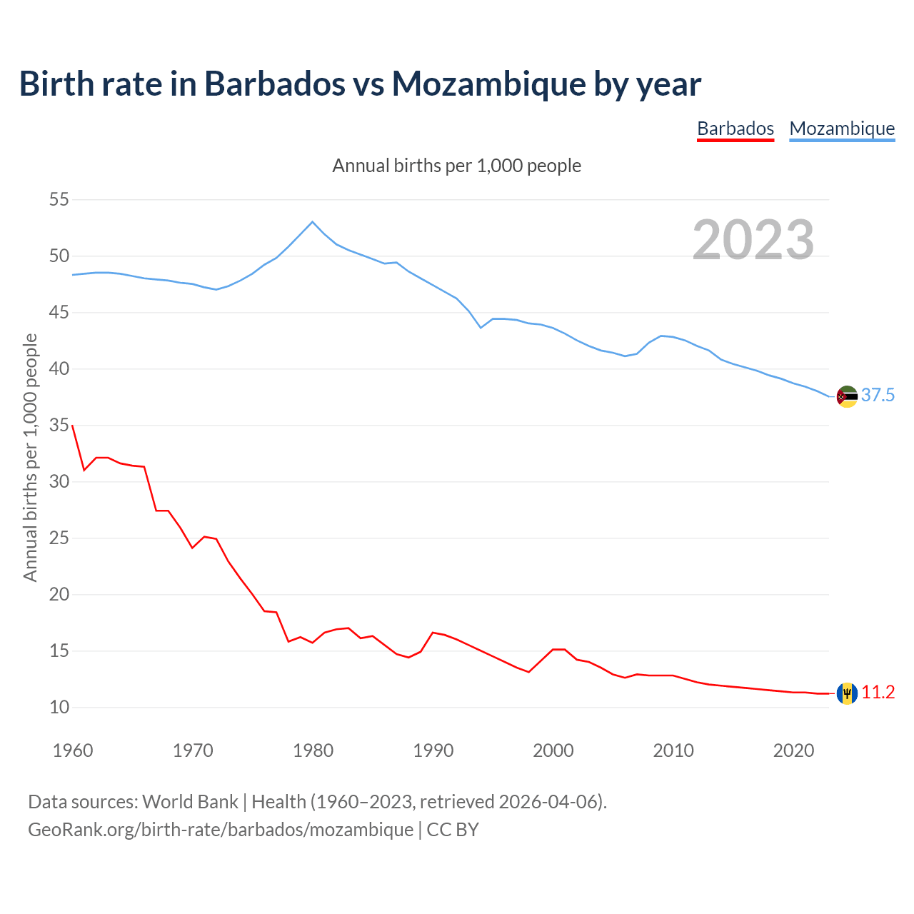 Barbados has an annual birth rate of 11.2 births per 1,000 people, compared to 37.5 for Mozambique. The average number of children a woman is expected to have during her lifetime — the fertility rate, is 1.71 in Barbados and 4.76 in Mozambique — 178.9% difference.