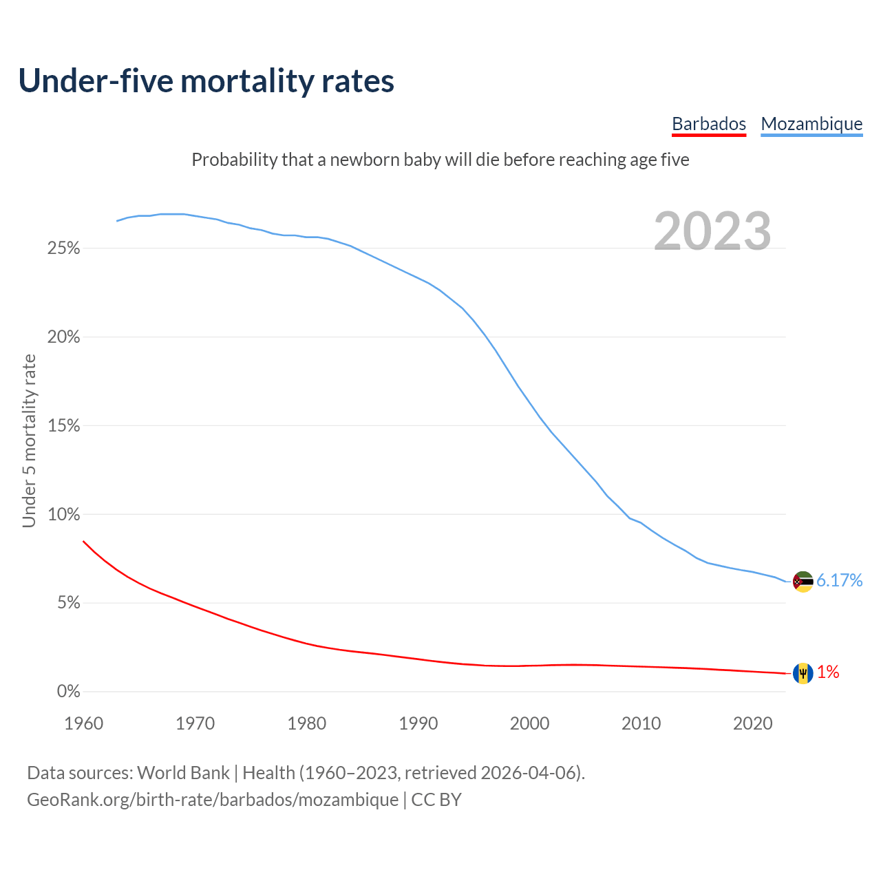 The chance that a newborn baby will die before reaching age five is 1% in Barbados and 6.17% in Mozambique. Above is a chart with historical data on under-five mortality rates.