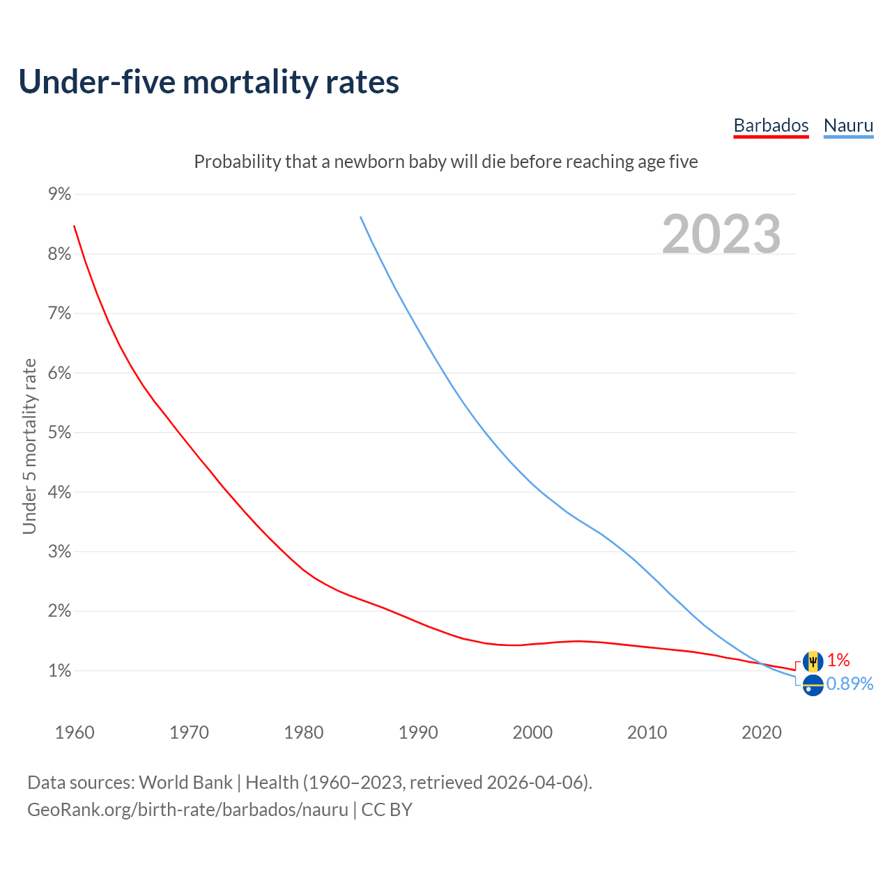 The chance that a newborn baby will die before reaching age five is 1% in Barbados and 0.89% in Nauru. Above is a chart with historical data on under-five mortality rates.