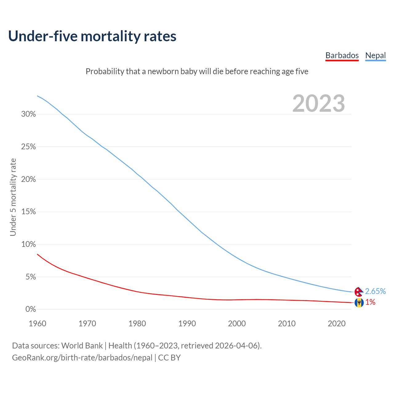 The chance that a newborn baby will die before reaching age five is 1% in Barbados and 2.65% in Nepal. Above is a chart with historical data on under-five mortality rates.