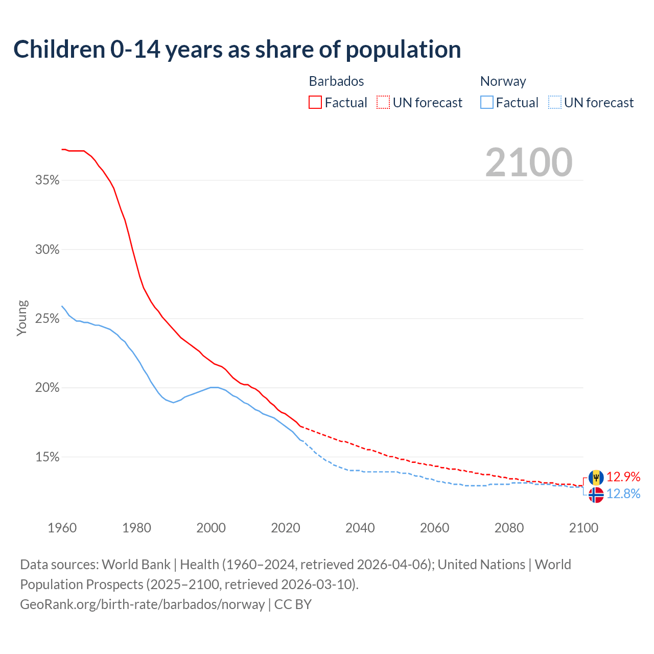 According to the latest available data on birth rates, the fertility rate in Barbados was 1.71 children per woman in 2023, compared to 1.4 in Norway in 2023. The replacement level is considered to be 2.1 children per woman.