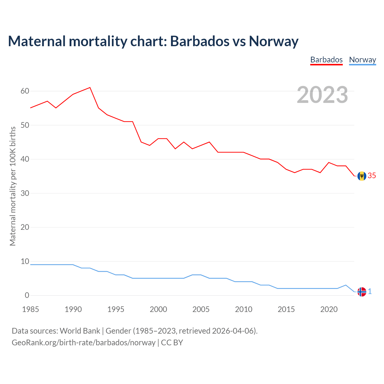 The maternal mortality rate, which is the probability of dying during childbirth or within 42 days of pregnancy termination, is 35 deaths per 100,000 live births in Barbados, compared to 1 deaths in Norway.