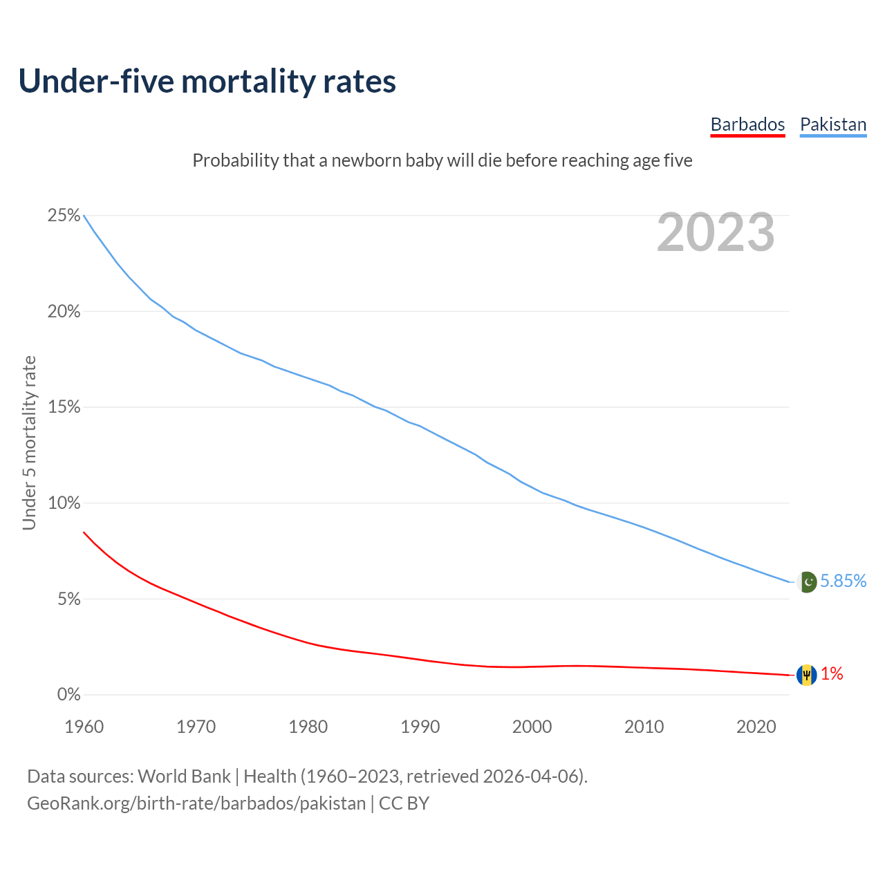 The chance that a newborn baby will die before reaching age five is 1% in Barbados and 5.85% in Pakistan. Above is a chart with historical data on under-five mortality rates.
