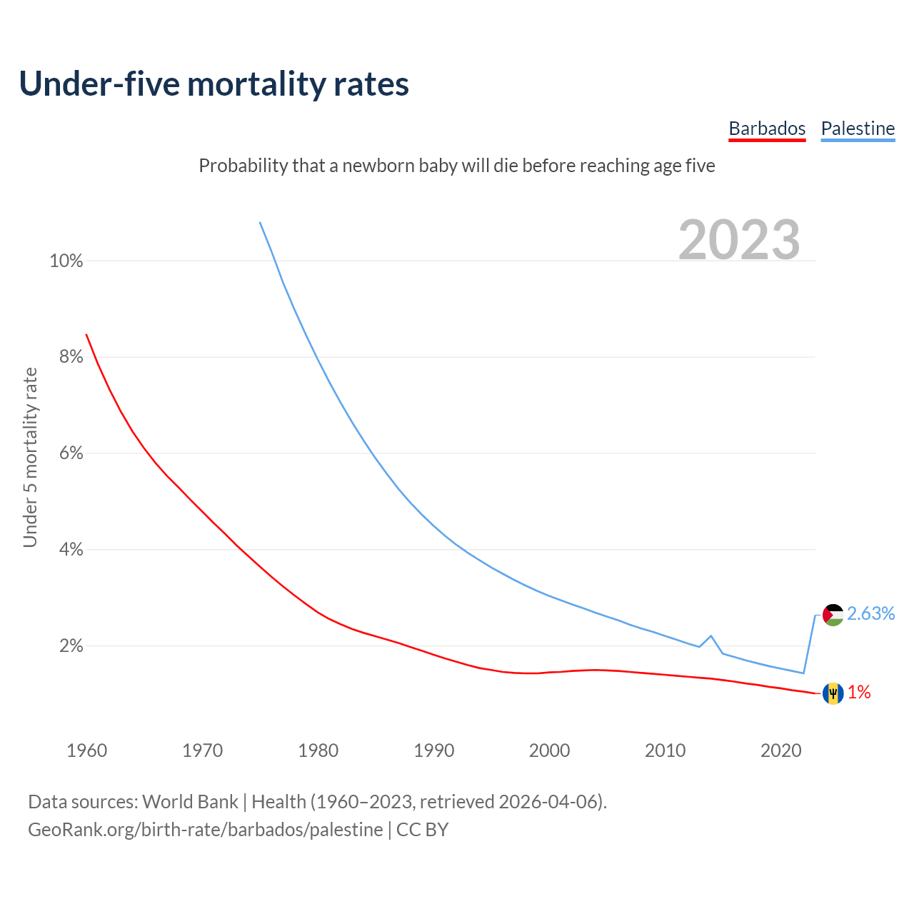 The chance that a newborn baby will die before reaching age five is 1% in Barbados and 2.63% in Palestine. Above is a chart with historical data on under-five mortality rates.