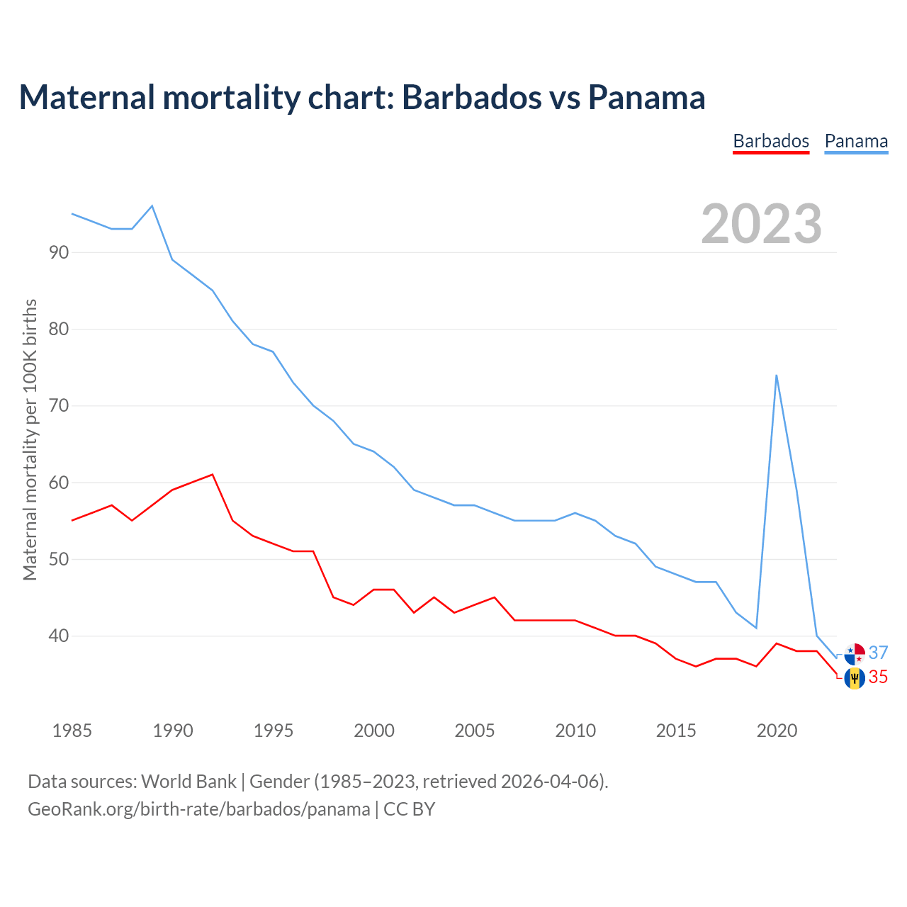 The maternal mortality rate, which is the probability of dying during childbirth or within 42 days of pregnancy termination, is 35 deaths per 100,000 live births in Barbados, compared to 37 deaths in Panama.