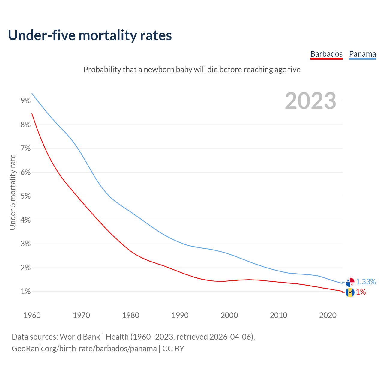 The chance that a newborn baby will die before reaching age five is 1% in Barbados and 1.33% in Panama. Above is a chart with historical data on under-five mortality rates.