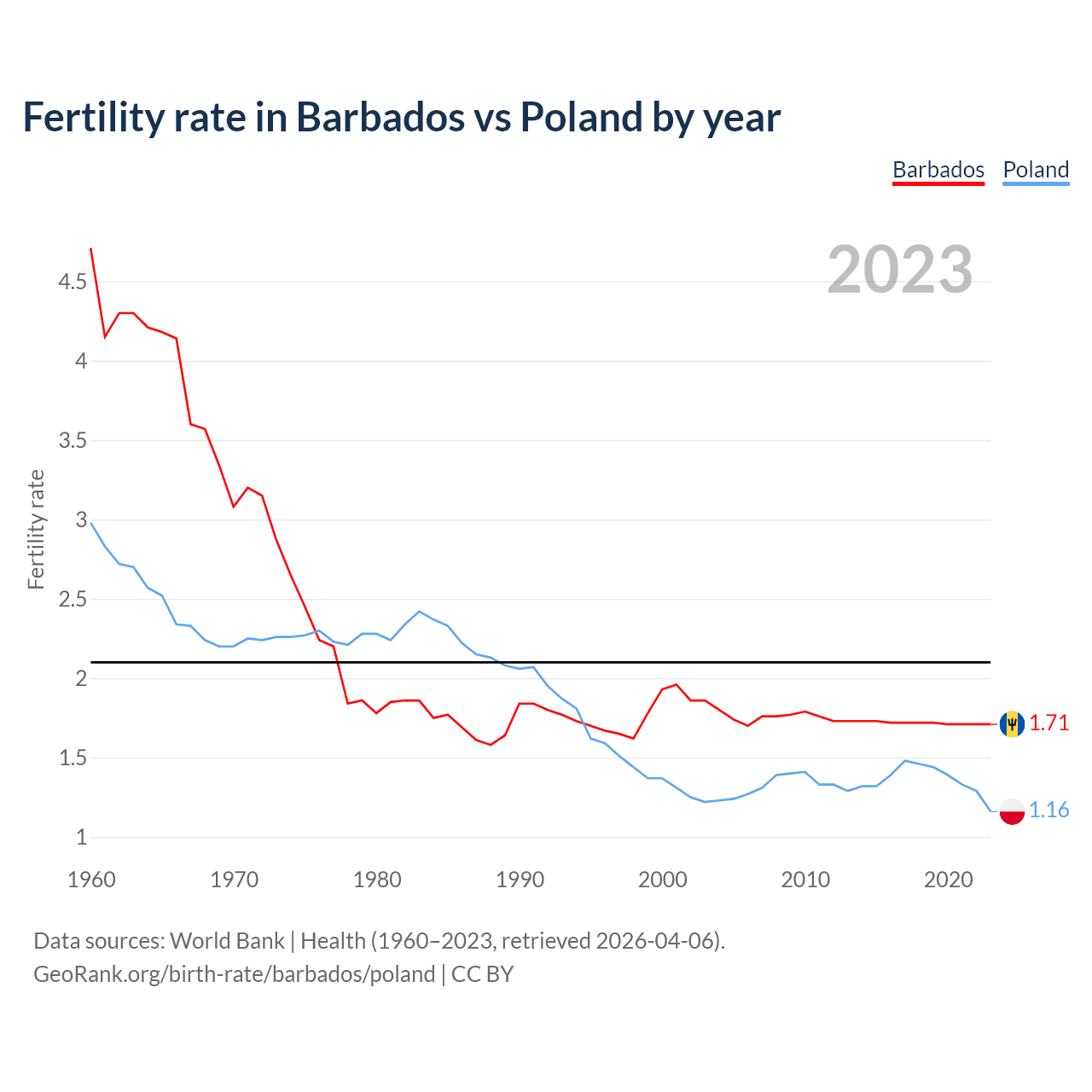 According to the latest available data on birth rates, the fertility rate in Barbados was 1.71 children per woman in 2023, compared to 1.16 in Poland in 2023. The replacement level is considered to be 2.1 children per woman.