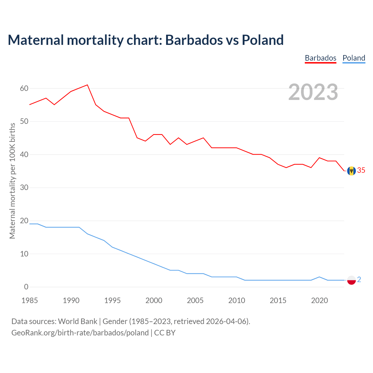 The maternal mortality rate, which is the probability of dying during childbirth or within 42 days of pregnancy termination, is 35 deaths per 100,000 live births in Barbados, compared to 2 deaths in Poland.