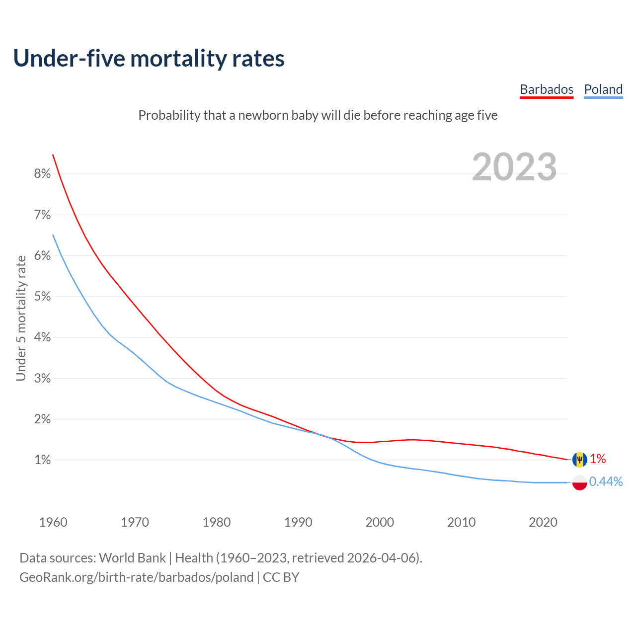 The chance that a newborn baby will die before reaching age five is 1% in Barbados and 0.44% in Poland. Above is a chart with historical data on under-five mortality rates.