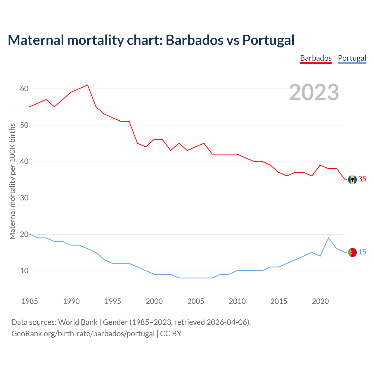 The maternal mortality rate, which is the probability of dying during childbirth or within 42 days of pregnancy termination, is 35 deaths per 100,000 live births in Barbados, compared to 15 deaths in Portugal.