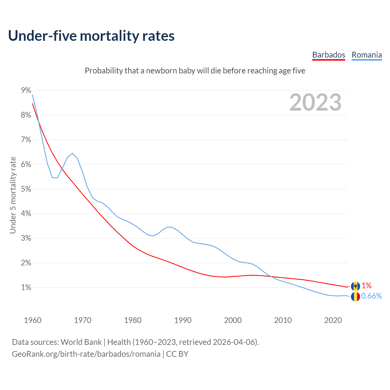The chance that a newborn baby will die before reaching age five is 1% in Barbados and 0.66% in Romania. Above is a chart with historical data on under-five mortality rates.