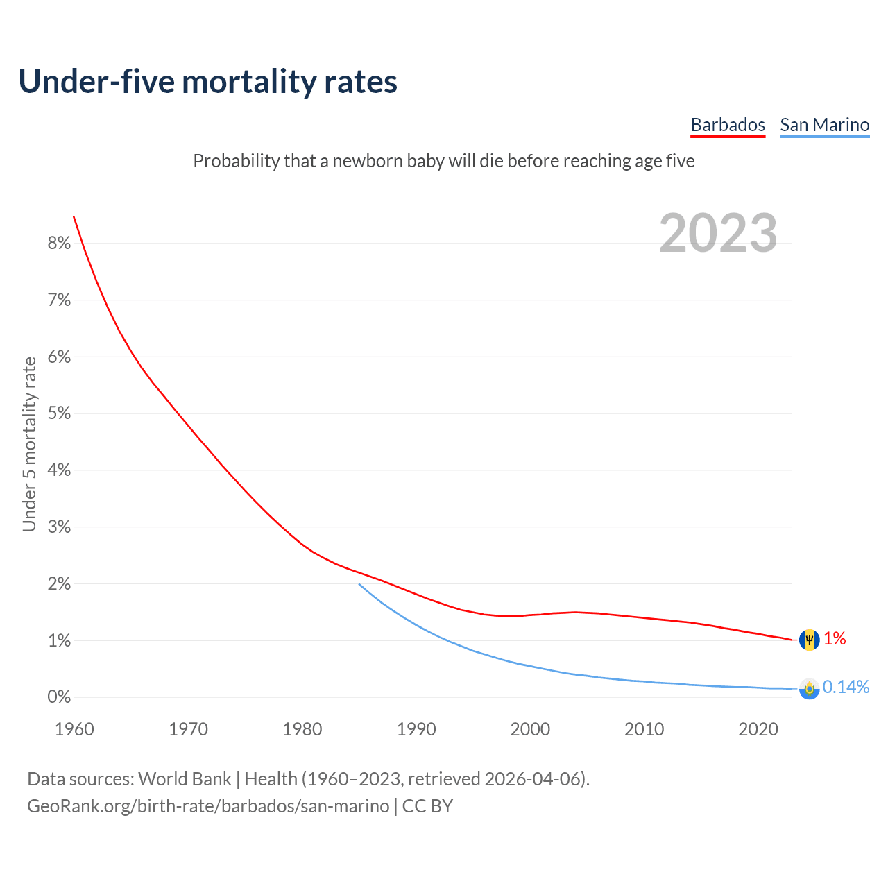 The chance that a newborn baby will die before reaching age five is 1% in Barbados and 0.14% in San Marino. Above is a chart with historical data on under-five mortality rates.