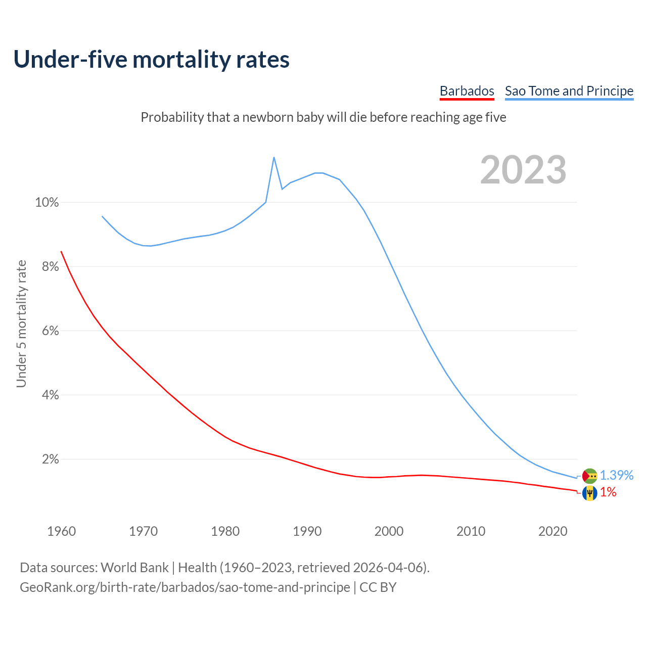 The chance that a newborn baby will die before reaching age five is 1% in Barbados and 1.39% in Sao Tome and Principe. Above is a chart with historical data on under-five mortality rates.