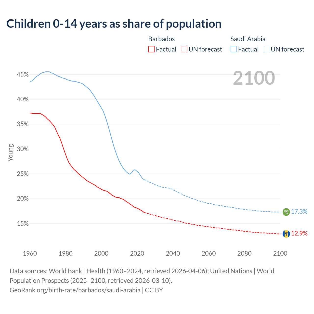 According to the latest available data on birth rates, the fertility rate in Barbados was 1.71 children per woman in 2023, compared to 2.28 in Saudi Arabia in 2023. The replacement level is considered to be 2.1 children per woman.
