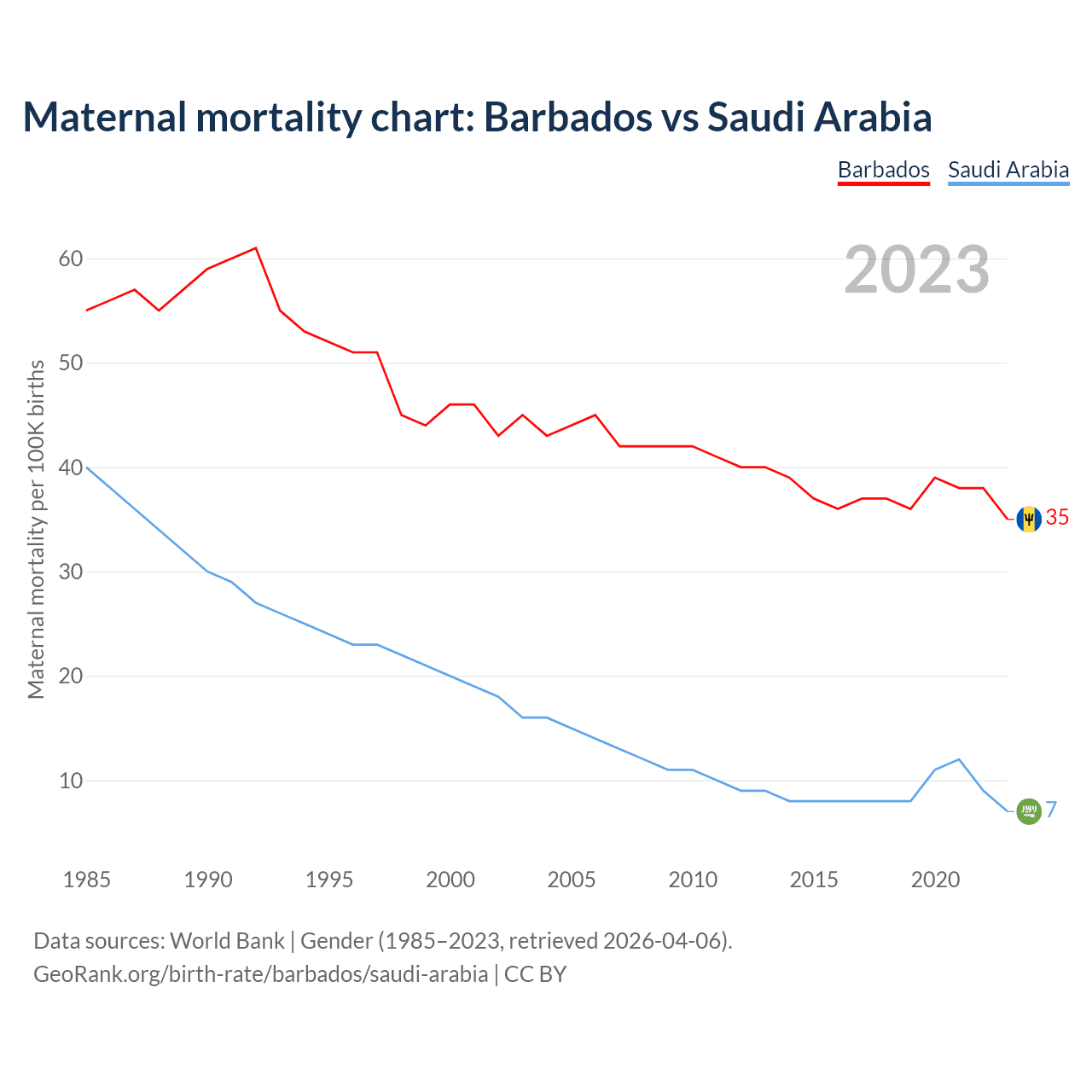 The maternal mortality rate, which is the probability of dying during childbirth or within 42 days of pregnancy termination, is 35 deaths per 100,000 live births in Barbados, compared to 7 deaths in Saudi Arabia.