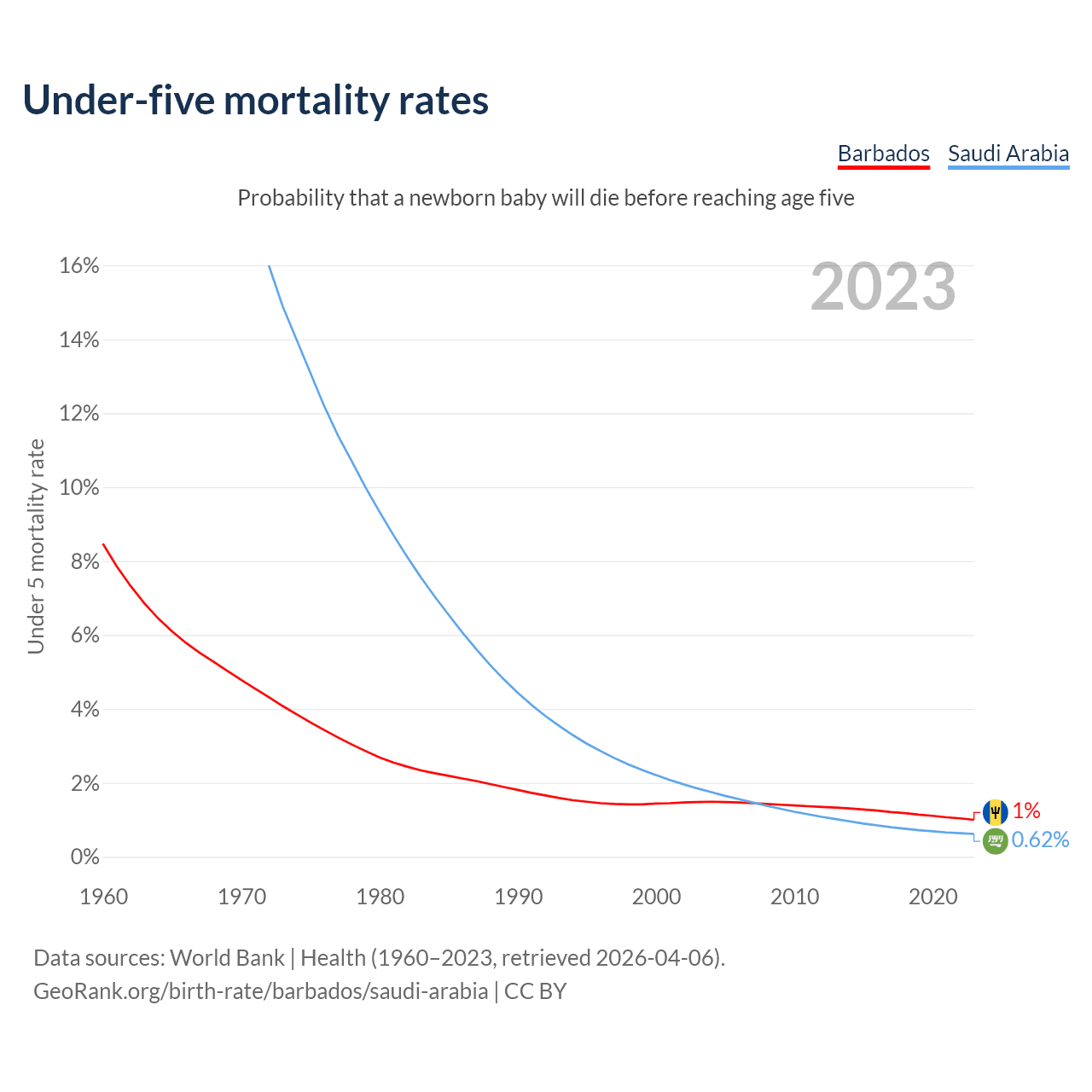 The chance that a newborn baby will die before reaching age five is 1% in Barbados and 0.62% in Saudi Arabia. Above is a chart with historical data on under-five mortality rates.