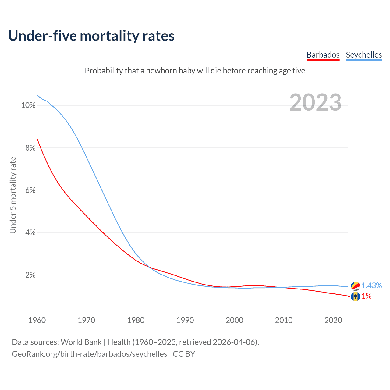 The chance that a newborn baby will die before reaching age five is 1% in Barbados and 1.43% in the Seychelles. Above is a chart with historical data on under-five mortality rates.