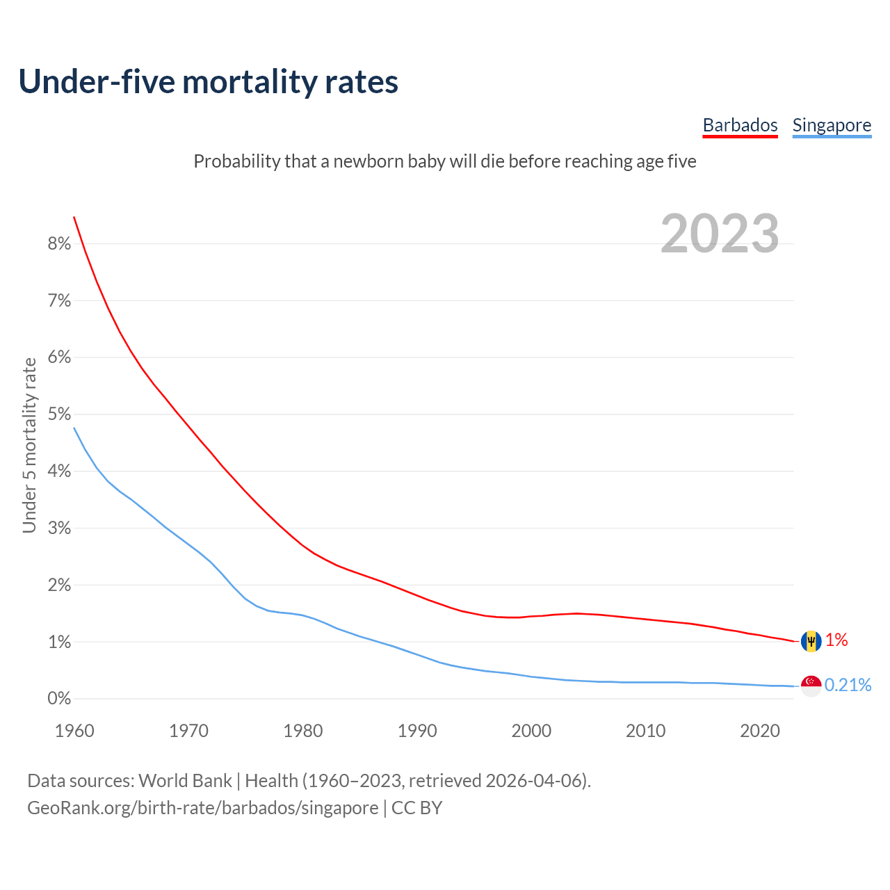 The chance that a newborn baby will die before reaching age five is 1% in Barbados and 0.21% in Singapore. Above is a chart with historical data on under-five mortality rates.