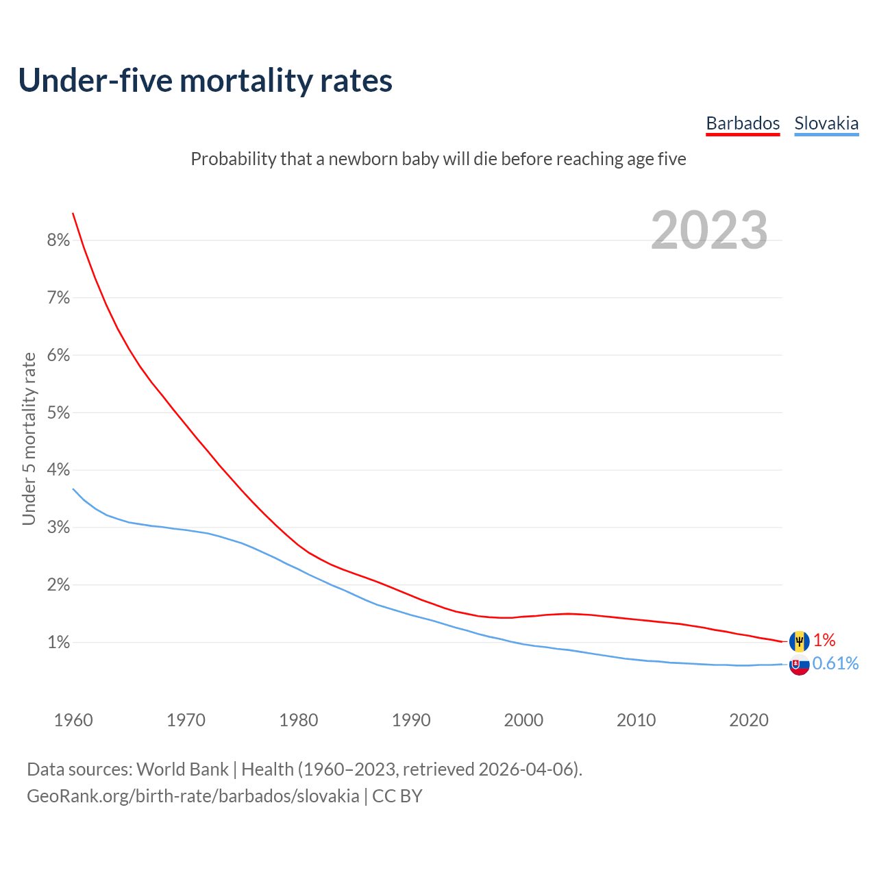 The chance that a newborn baby will die before reaching age five is 1% in Barbados and 0.61% in Slovakia. Above is a chart with historical data on under-five mortality rates.