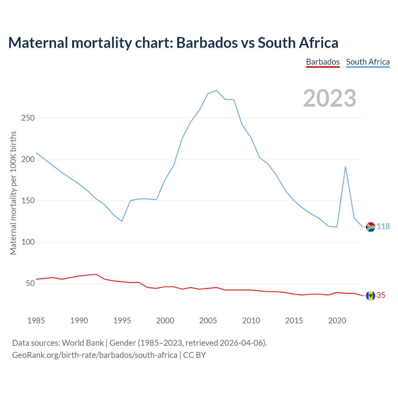The maternal mortality rate, which is the probability of dying during childbirth or within 42 days of pregnancy termination, is 35 deaths per 100,000 live births in Barbados, compared to 118 deaths in South Africa.