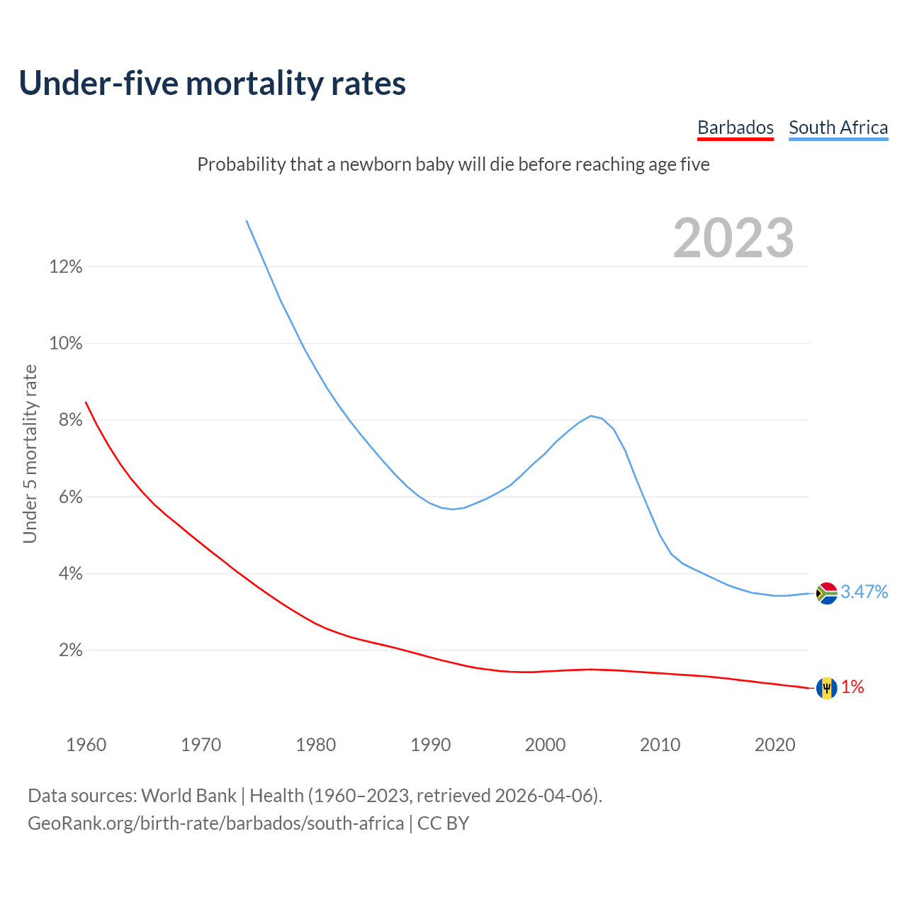 The chance that a newborn baby will die before reaching age five is 1% in Barbados and 3.47% in South Africa. Above is a chart with historical data on under-five mortality rates.
